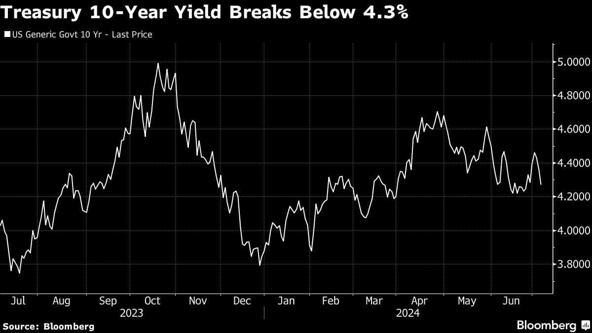 Treasury 10-year yields fell eight basis points to 4.28%. The dollar extended its weekly drop. Bitcoin sank. The pound climbed after Keir Starmer's Labour party swept to a landslide election win.