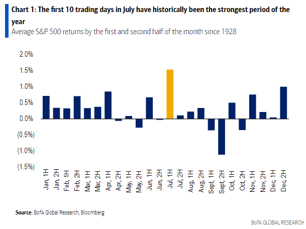 Since 1928, the first 10 trading days of July have historically been the strongest period for the S&P 500, with the benchmark stocks gauge advancing 1.5% on average, rising nearly 70% of the time, according to Bank of America Corp.