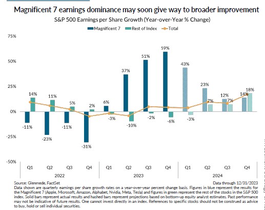 The dominance of the “Magnificent Seven” may soon give way to a broadening of earnings growth that is supportive of a variety of equity asset classes, according to Glenmede's Jason Pride and Michael Reynolds.
