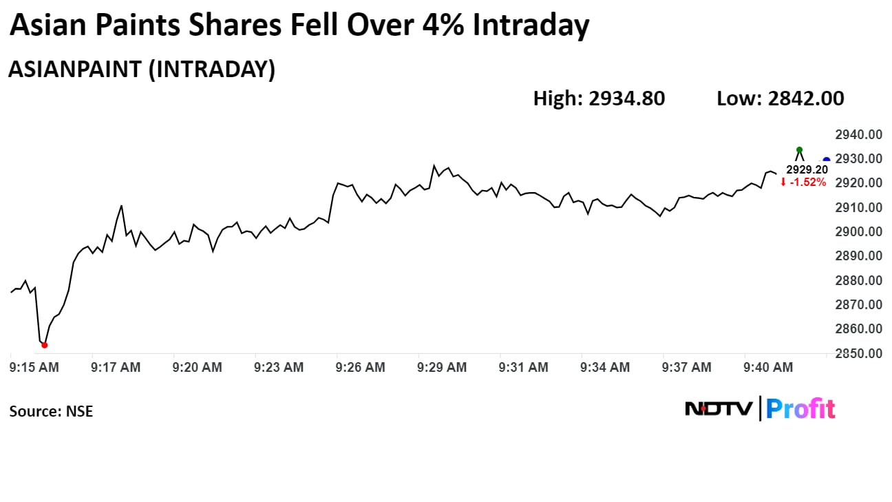 On the NSE, Asian Paints' stock fell as much as 4.45% in early trade to Rs 2,842 apiece, the lowest since May 22. It was trading 2.01% lower at Rs 2,914.5 per share, compared to a 0.33% advance in the benchmark Nifty 50 as of 9:40 a.m.