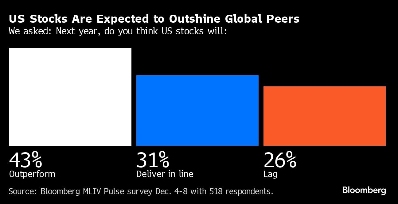The S&P 500 will hit a record high in 2024 as the US avoids sinking into a recession, although a weaker consumer will mean the index gains less than this year's 20% surge, according to Bloomberg's latest Markets Live Pulse survey.