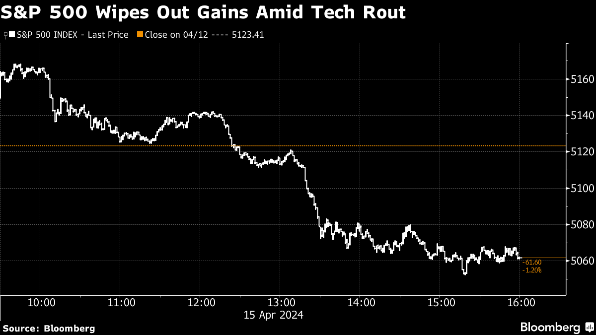 The S&P 500 broke below 5,100, dropping to the lowest in almost two months. The tech-heavy Nasdaq 100 slid over 1.5%. Both gauges breached their 50-day moving averages — seen as a bearish signal by several chartists. Banks outperformed on a surprise profit from Goldman Sachs Group Inc.