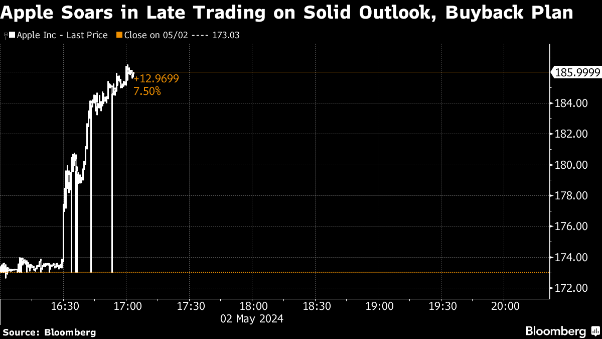 A $250 billion exchange-traded fund tracking the Nasdaq 100 powered higher after the close of regular trading, with Apple soaring after predicting a return to sales growth in the current period. Following the steps of fellow big techs Alphabet Inc. and Meta Platforms Inc., the company approved plans to buy back an additional $110 billion of its shares.