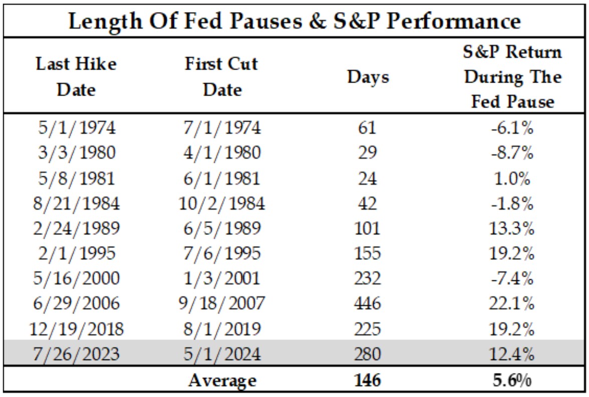 After Wednesday's Fed decision to hold rates, the length of the current pause reached 280 days — which remains the second-longest on record, according to Ryan Grabinski at Strategas Securities.