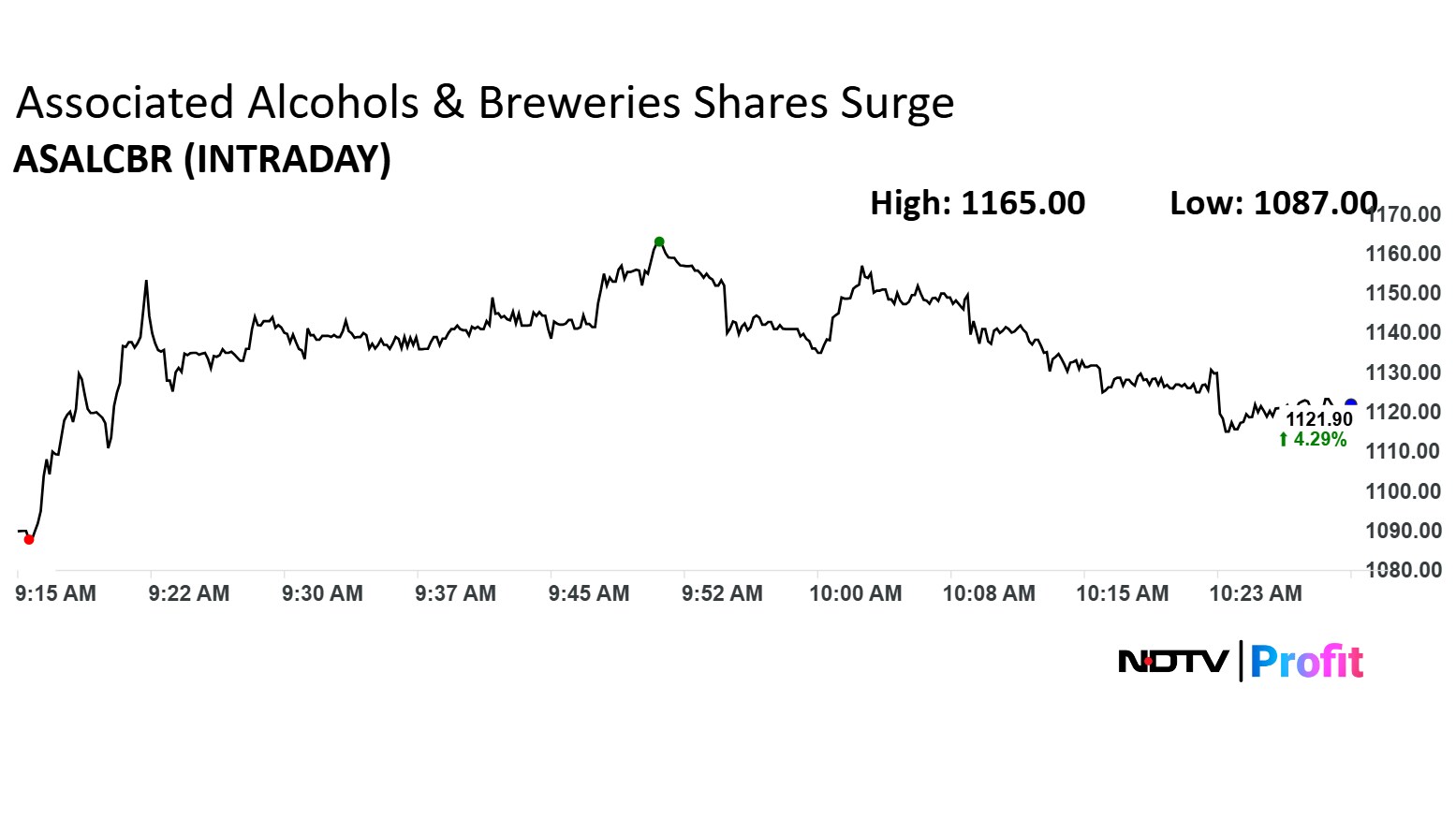 Shares of Associated Alcohols & Breweries surged as much as 8.29% to Rs 1,165 apiece. They pared gains to trade 4.29% higher at Rs 1,121.90 apiece, as of 10:30 a.m. This compares to a 0.04% advance in the NSE Nifty 50.