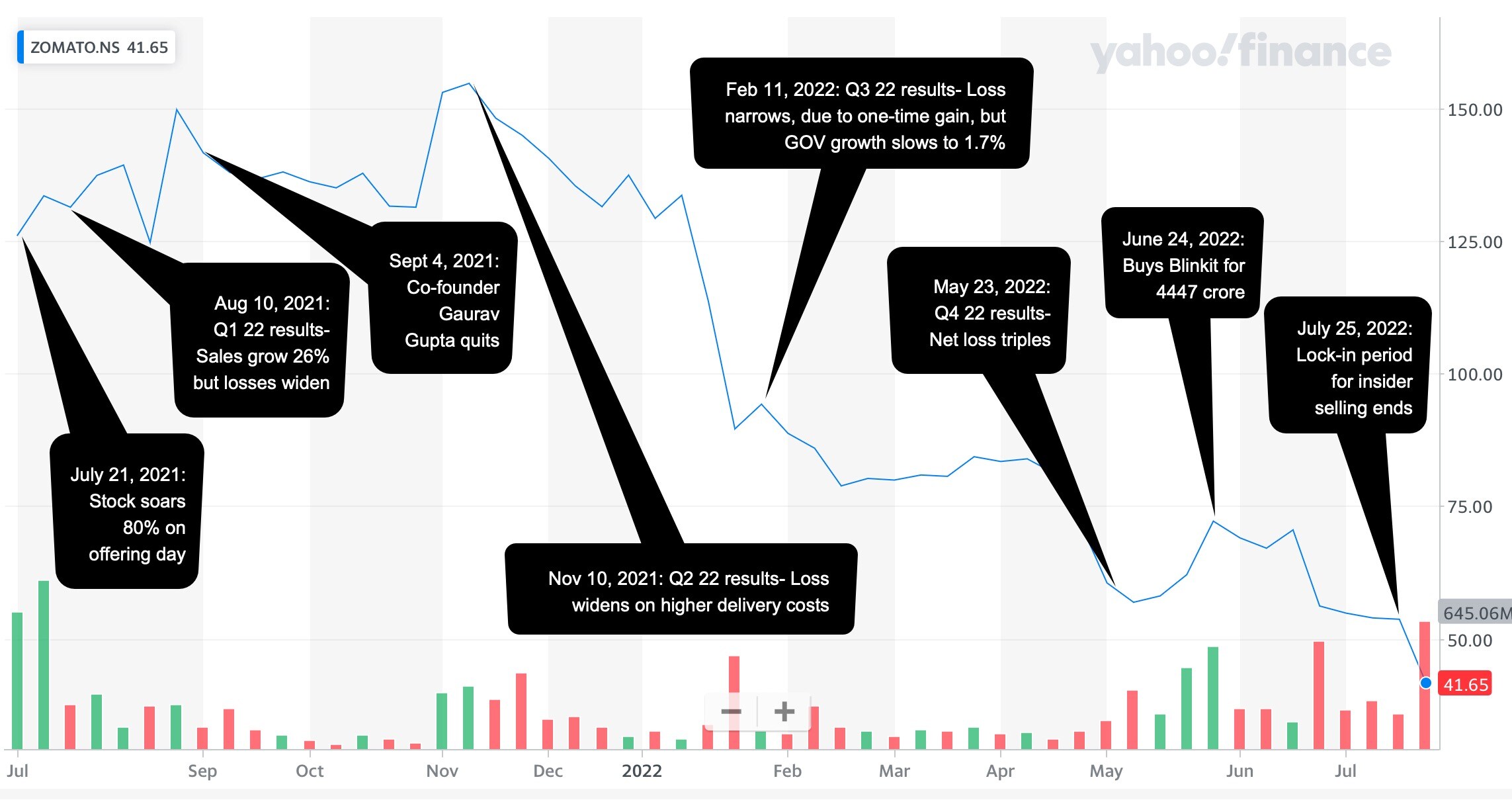 In 2022, though, the company's stock rediscovered the laws of gravity, and news stories that would have elicited positive responses in 2021 are having the opposite effect. The most recent plunge in the stock price seems to have been precipitated by Zomato's acquisition of Blinkit, a grocery delivery company, for $570 million (Rs 4,400 crores), on June 24, 2022, and the expiration of the lock-in period, allowing insiders to sell shares in the company. At close of trading on July 26, Zomato's stock price was at Rs 41.65 per share.