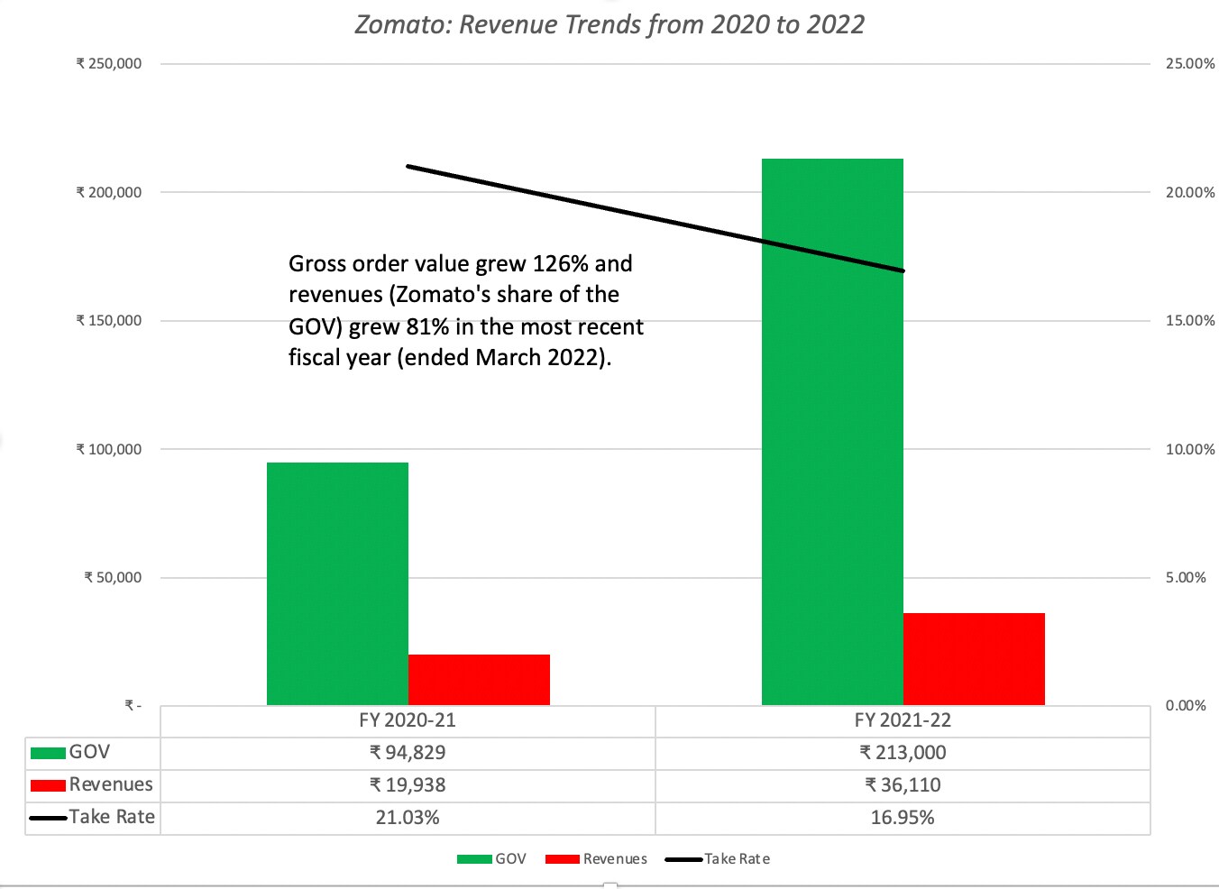 In the year since my IPO valuation, there have been four quarterly reports from the company, in addition to news stories about governance and the company's legal challenges, and there is a mix of good and bad news in them. On the good news front, the food delivery market in India has continued to grow over the last year, and Zomato has been able to maintain its market share. In fact, there are signs that the market is consolidating with Zomato and Swiggy controlling 90% of the market share of restaurant deliveries. As a consequence, Zomato's gross order value and revenues have both jumped over the course of the last year: