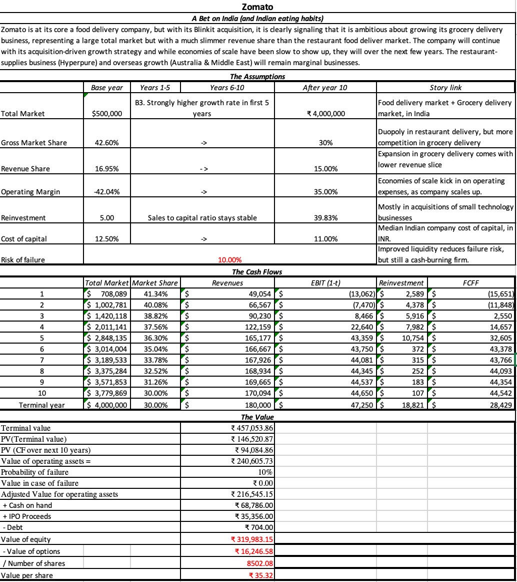 Using my test of whether a valuation story is possible (the weakest test), plausible (a stronger test) and probable (the acid test), I posited that you could justify a value per share for Zomato of Rs 40-50, per share, with plausible stories, but that valuations that were much higher required pushing the limits of plausible narratives.