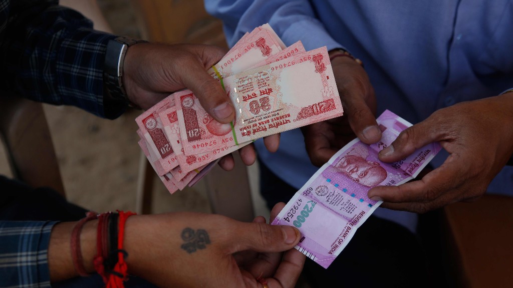An Indian man, left, gets a high denomination currency note of Indian rupees 2000 exchanged for smaller notes at a roadside stall.(Photo: AP)