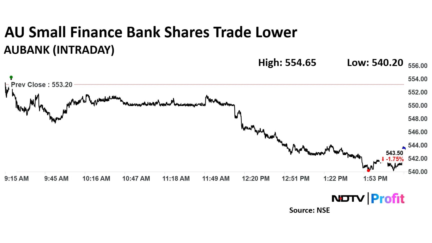 Shares of AU Small Finance Bank fell as much as 2.35% to Rs 540.20 apiece, before paring loss to trade 1.75% lower at Rs 543.50 apiece, as of 2:25 p.m. This compares to a 0.09% advance in the NSE Nifty 50.