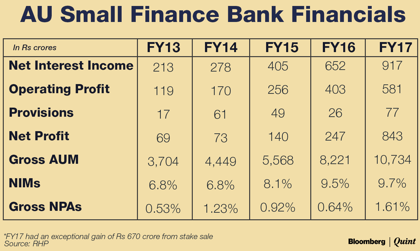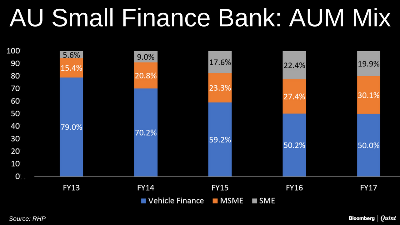 Founded in 1996 as a non-deposit taking asset finance company by Sanjay Agarwal, AU Small Finance Bank was one of the 10 entities that received the licence from the Reserve Bank of India. It lends to low and middle-income individuals and small and medium businesses. The lender has 269 branches across 10 states, and Rajasthan contributes more than half of its assets under management. Vehicle loans contribute half of its advances, and it plans to enter gold, housing and farm lending segments.
