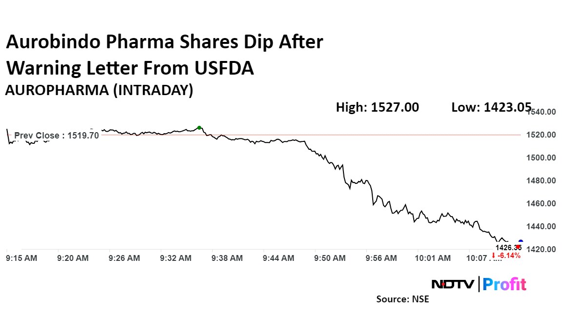 Shares of Aurobindo Pharma Ltd. declined over 6% on Friday after the manufacturing facility of a subsidiary received a warning letter from the US Food and Drug Administration.