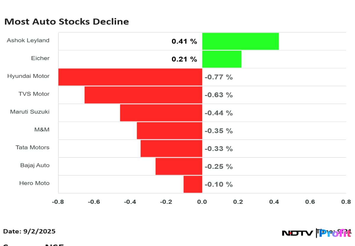 Most auto stock were trading lower on Sept 2, a day after reporting sales data for Aug. 2025. The data for the sector came in largely mixed compared to previous month. Hyundai Motor India Ltd. declined 1.04% at intraday so far, followed by TVS Motors Company Ltd. which fell 0.69%.