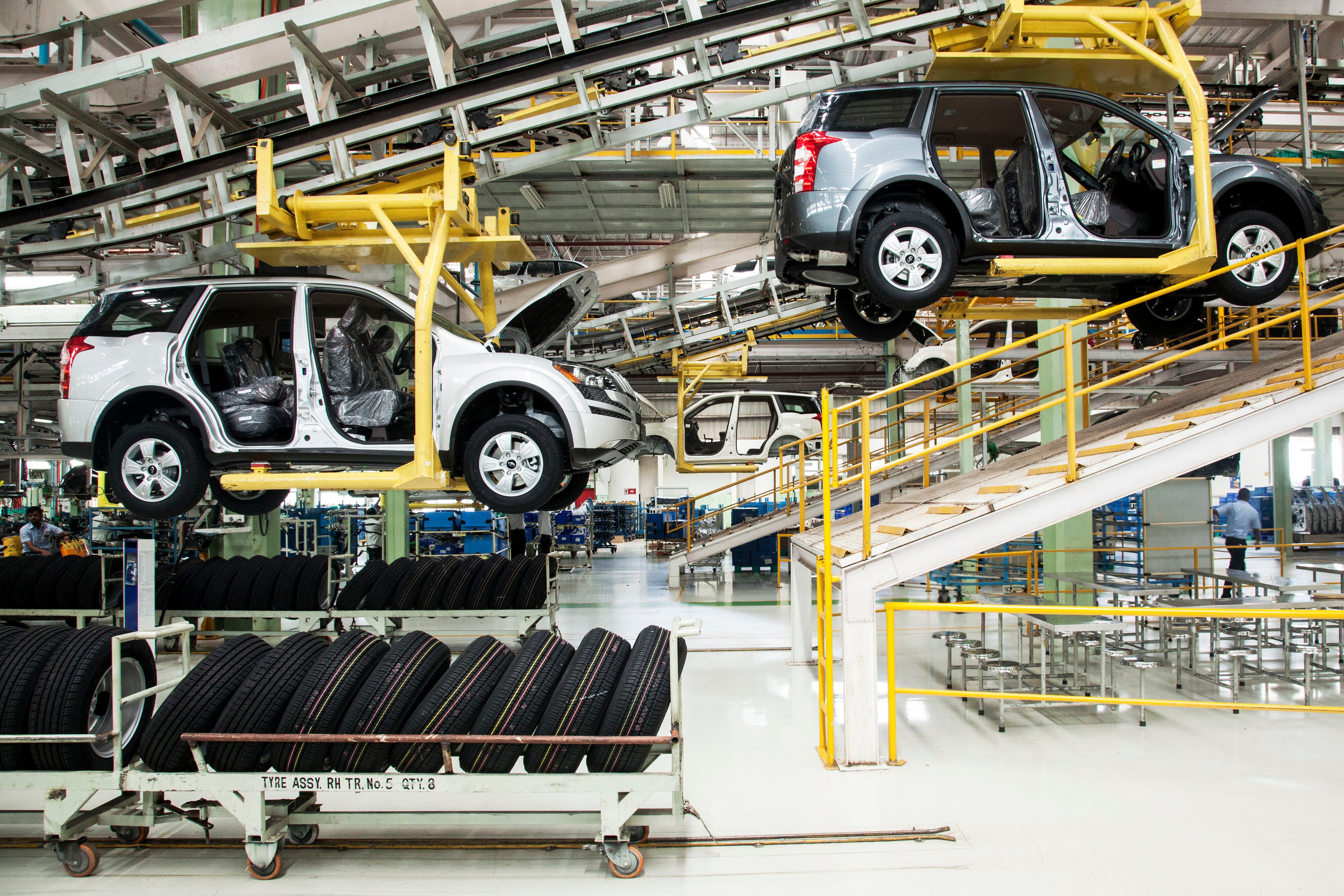Sport-utility vehicles move along a conveyor on the production line at a manufacturing unit in Chakan, Maharashtra, India. (Photographer: Udit Kulshrestha/Bloomberg)