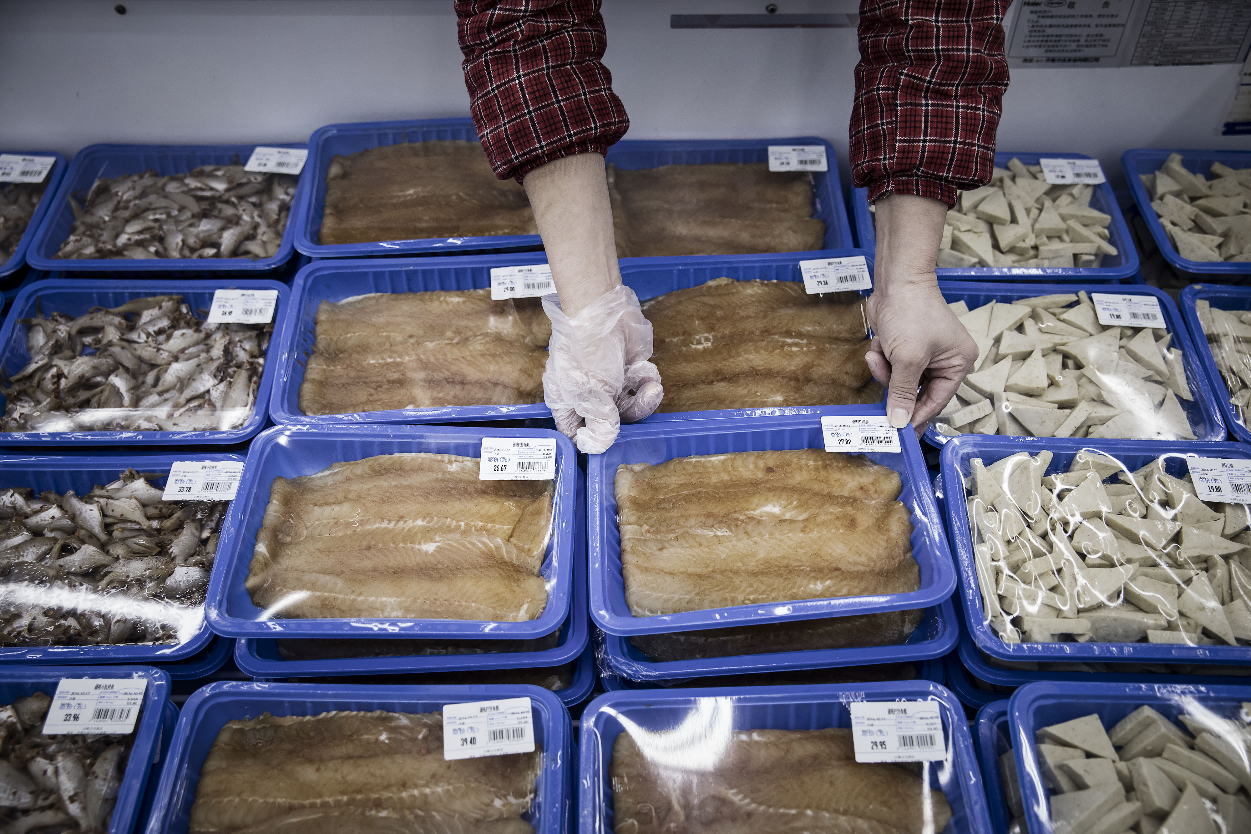 An employee arranges packaged seafood inside a Wal-Mart Stores Inc.’s Sam’s Club store in Zhuhai, China. (Photographer: Qilai Shen/Bloomberg)