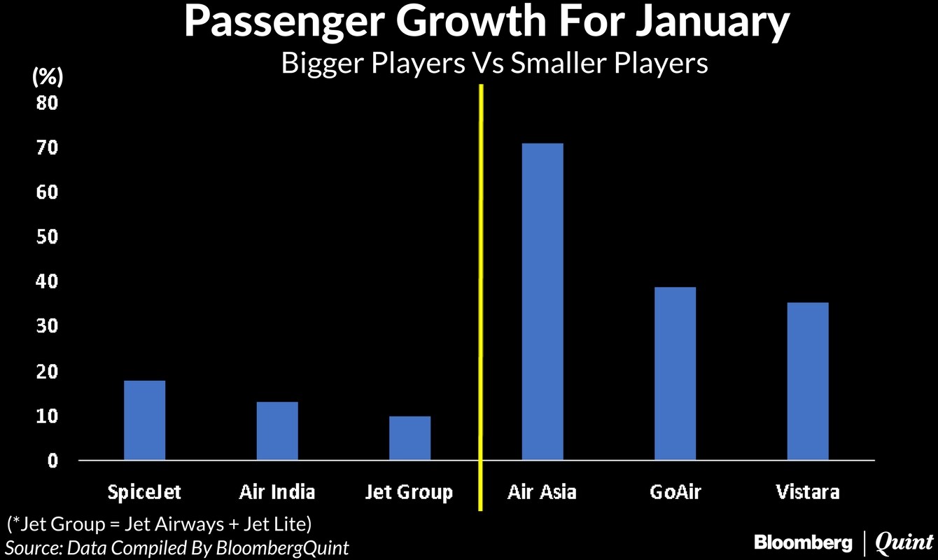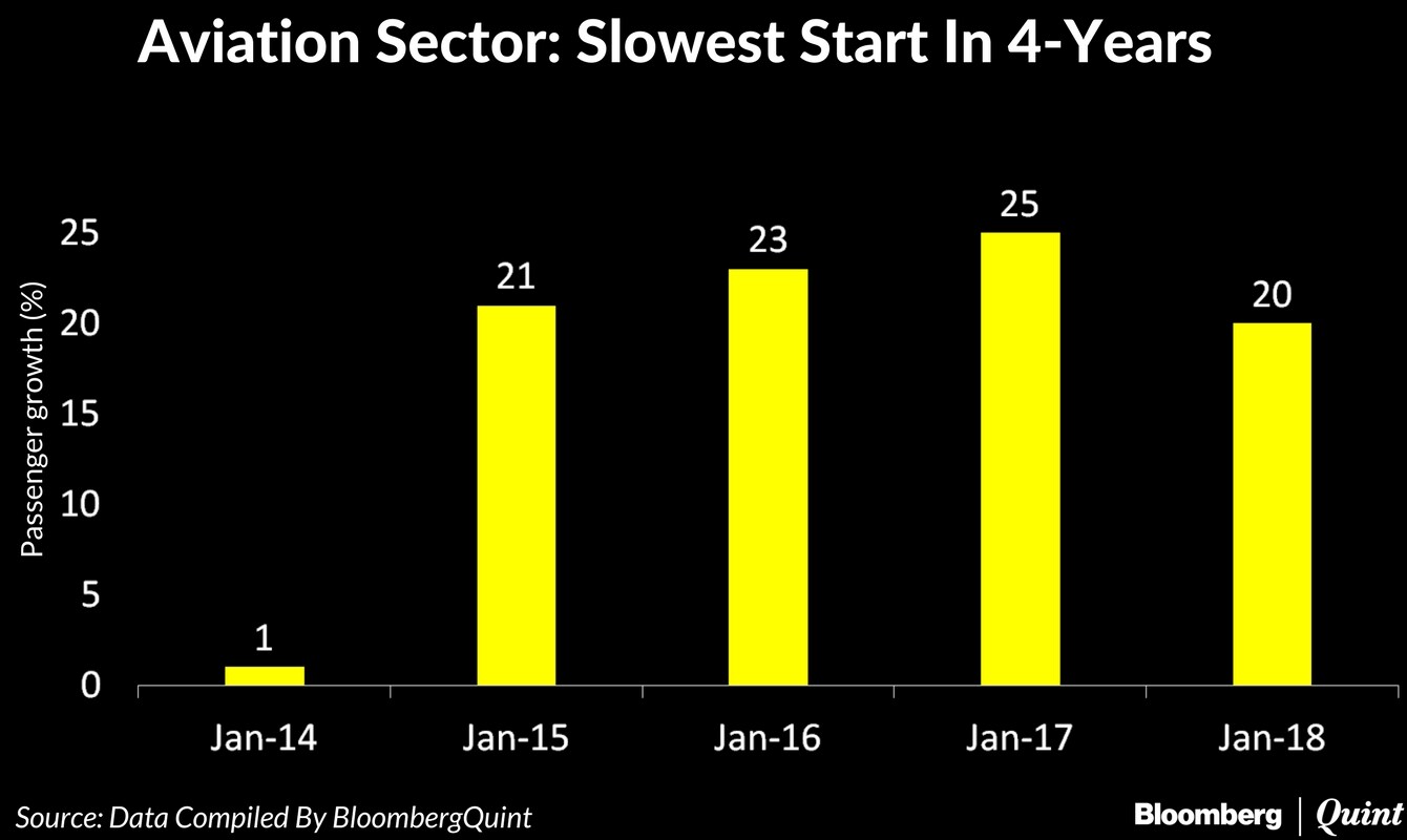 Airline passenger traffic in the world's fastest-growing market rose at 20 percent in January as 11 million Indians flew in domestic carriers. Yet, that was the slowest pace of growth in the first month since 2014, according to data compiled by BloombergQuint.