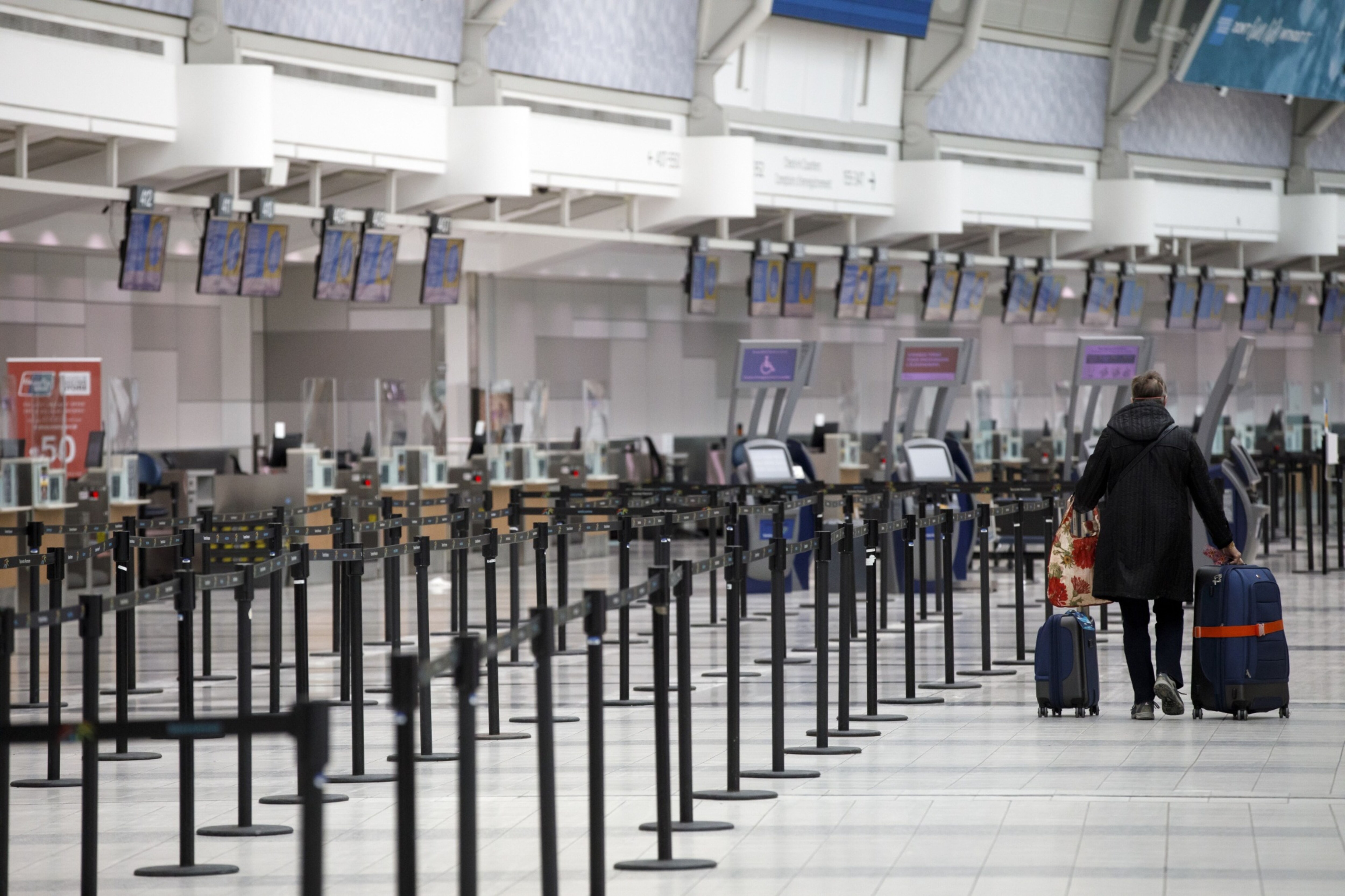 A traveler passes in front of empty check in counters at   International Airport in Canada. (Photographer: Cole Burston/Bloomberg)