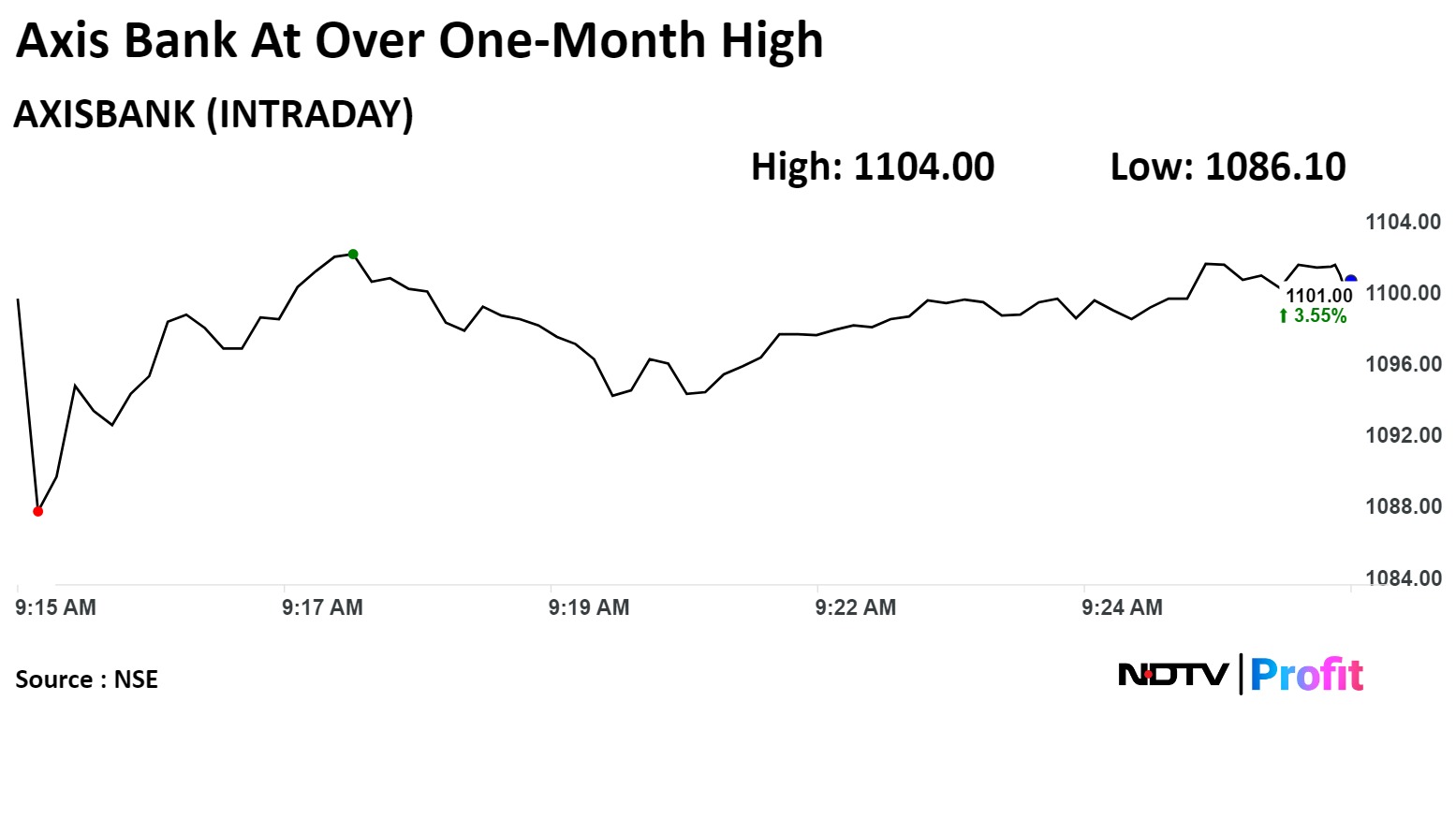 On the NSE, shares of Axis Bank rose as much as 3.83% during the day to Rs 1,104 apiece, the highest since March 12. It was trading 3.49% higher at Rs 1,100.35 per share, compared to a 0.32% decline in the benchmark Nifty 50 at 9:29 a.m.