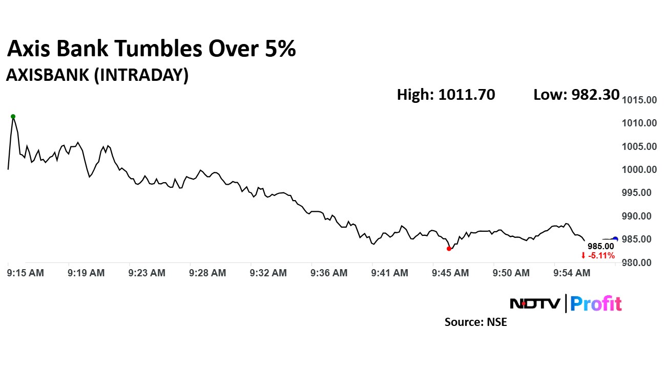 Axis Bank share price declined 5.37% to Rs 982.30 apiece. It was trading 5.27% down at Rs 983.30 apiece as of 9:58 a.m., as compared to 0.42% decline in the NSE Nifty 50 index.