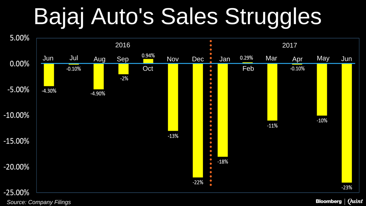 Bajaj Auto Ltd.'s sales fell for the fourth straight month in June, dragged down by a decline in demand for its motorcycles.