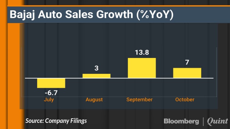 Bajaj Auto Ltd.'s sales rose for the third straight month in October, driven by a healthy growth in exports.