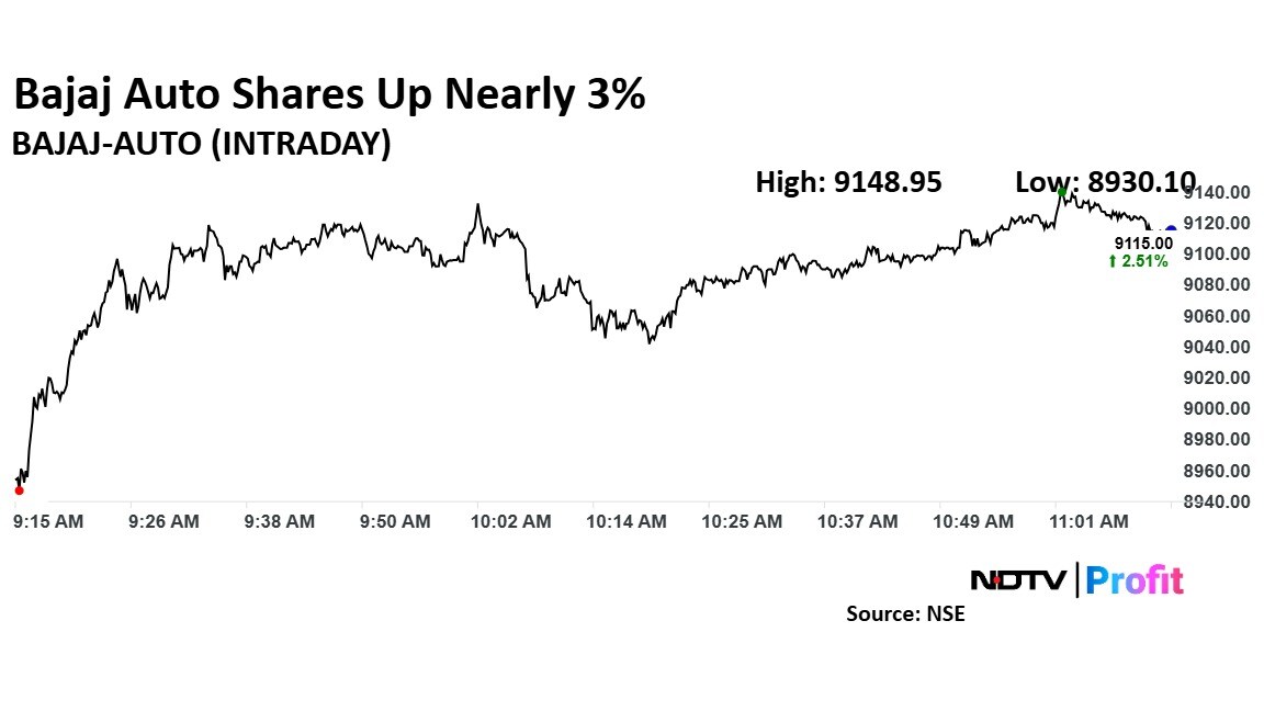 Bajaj Auto stock rose as much as 2.89% during the day to Rs 9,148.95 apiece on the NSE. It was trading 2.51% higher at Rs 9,115 apiece, when the benchmark Nifty 50 was trading flat as of 11:16 a.m.