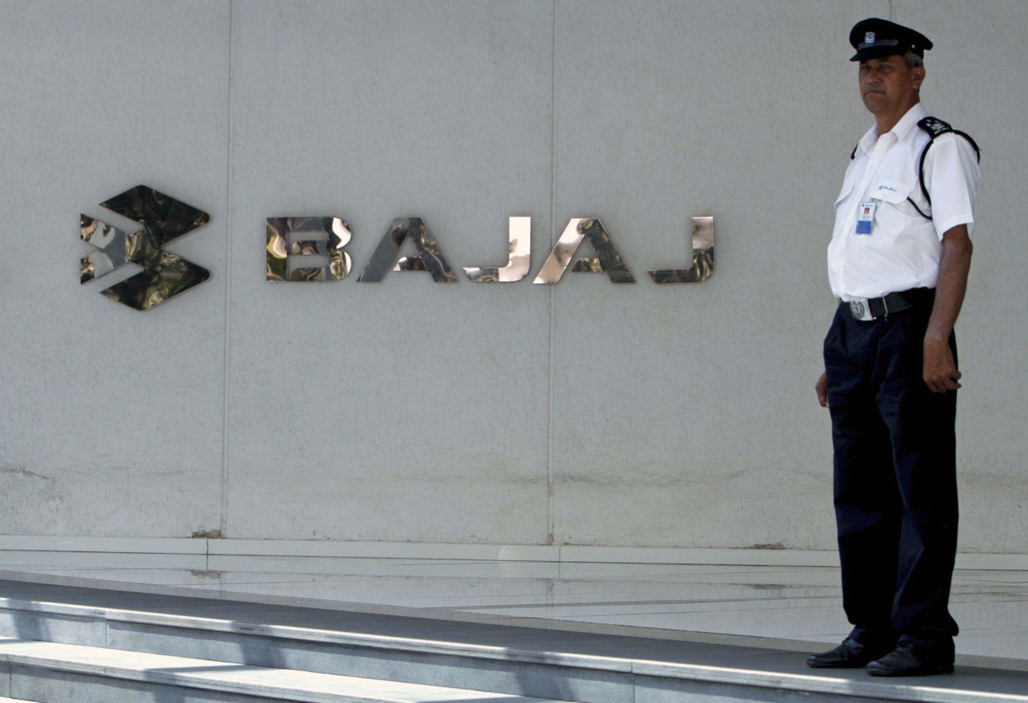 A security guard stands in front of a Bajaj Auto Ltd. logo in Pune, India. (Photographer: Adeel Halim/Bloomberg)