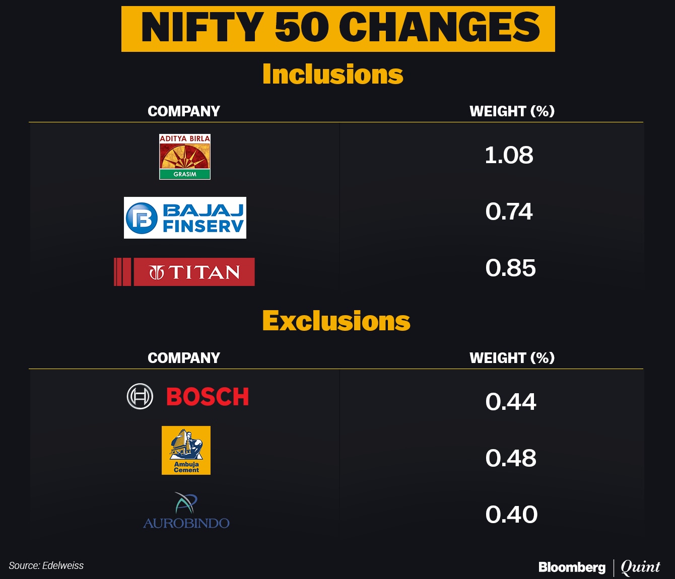 Ambuja Cements Ltd., Aurobindo Pharma Ltd., and Bosch Ltd. will be excluded. With Bajaj Finserv's inclusion, the number of financial services firms in the Nifty will increase to 11, while Aurobindo Pharma's exit will bring down the number of pharma companies to four.