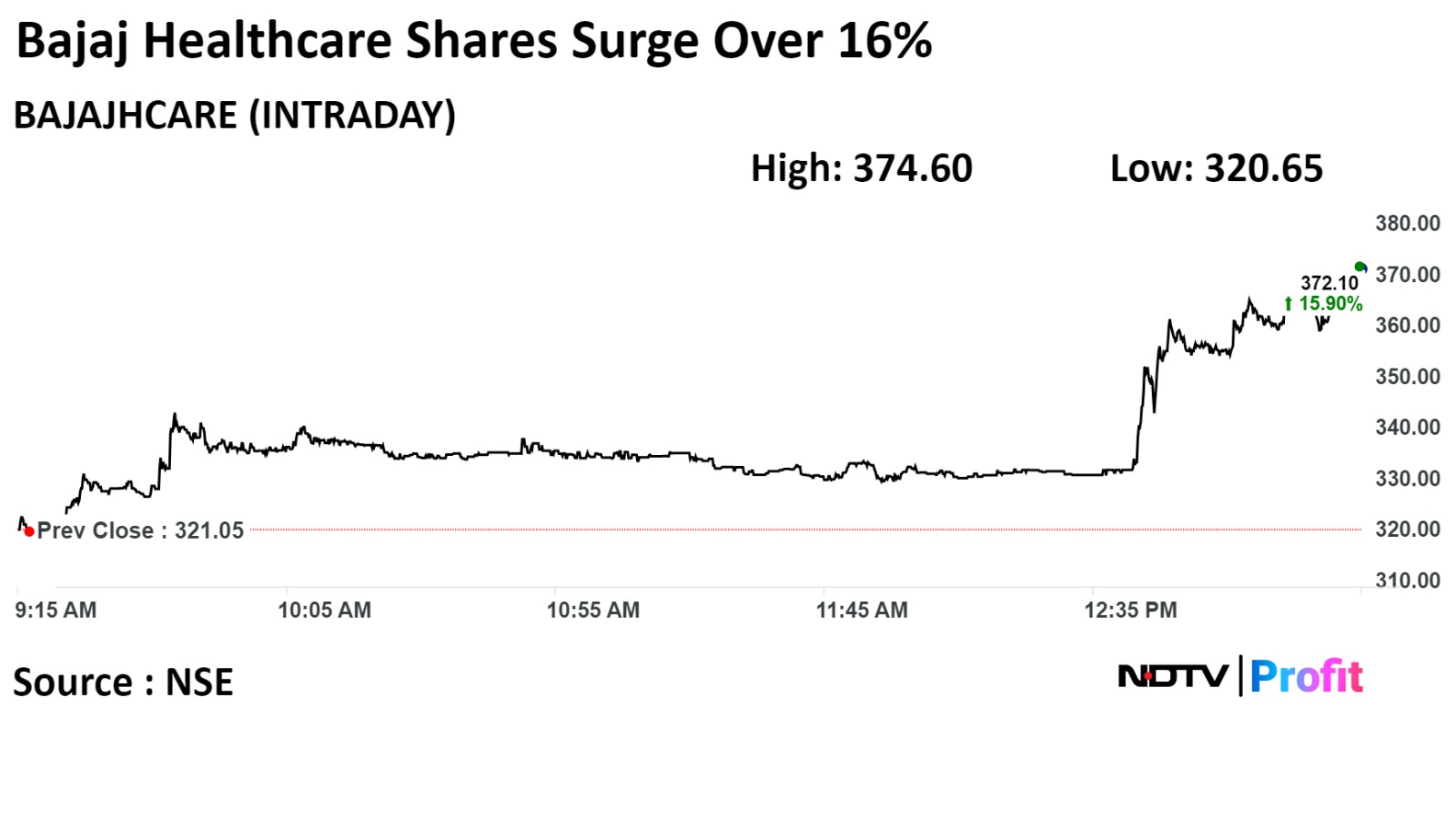 Bajaj Healthcare's stock rose as much as 16.68% during the day to Rs 374.60 apiece on the NSE. It was trading 16.13% higher at Rs 372.85 per share, compared to a 0.89% decline in the benchmark Nifty 50 at 1:26 p.m.