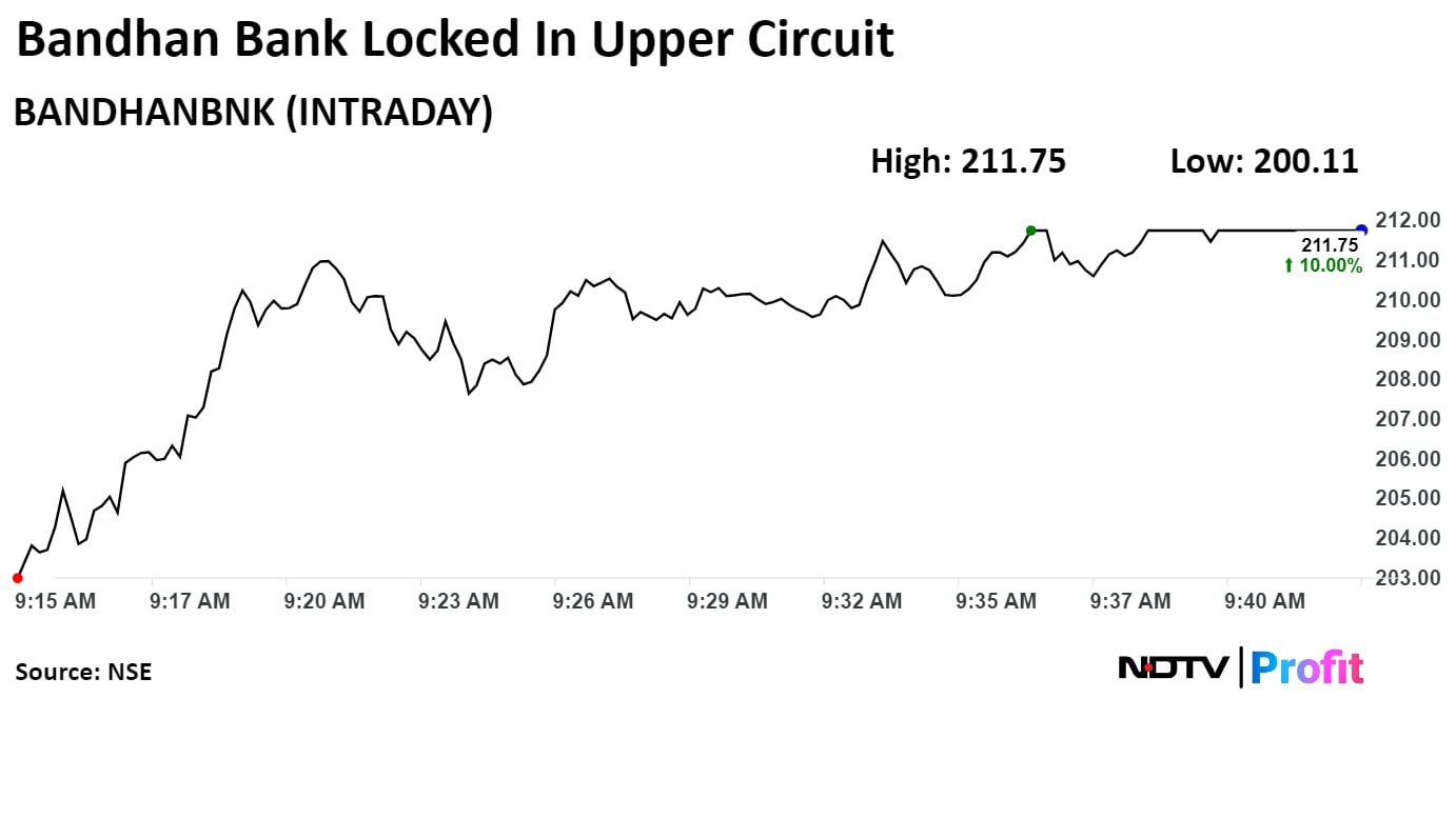 On the NSE, shares of Bandhan Bank hit the 10% upper circuit and rose to Rs 211.75, the highest since July 4. It remained locked in the upper circuit as of 09:46 a.m., compared to 0.30% advance in the NSE Nifty 50.