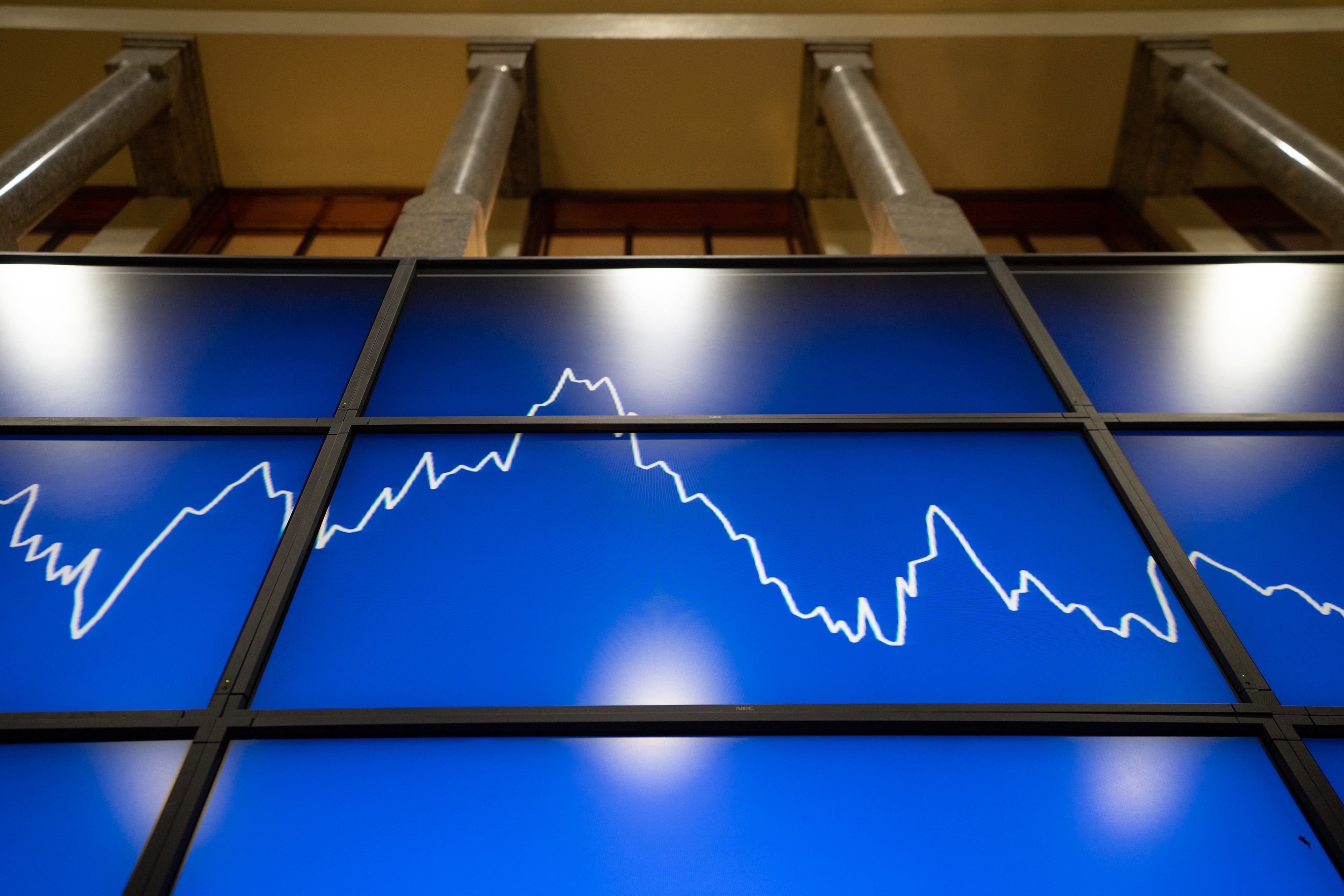 A chart’s curve is displayed on a screen inside a stock exchange. (Photographer: Jasper Juinen/Bloomberg)