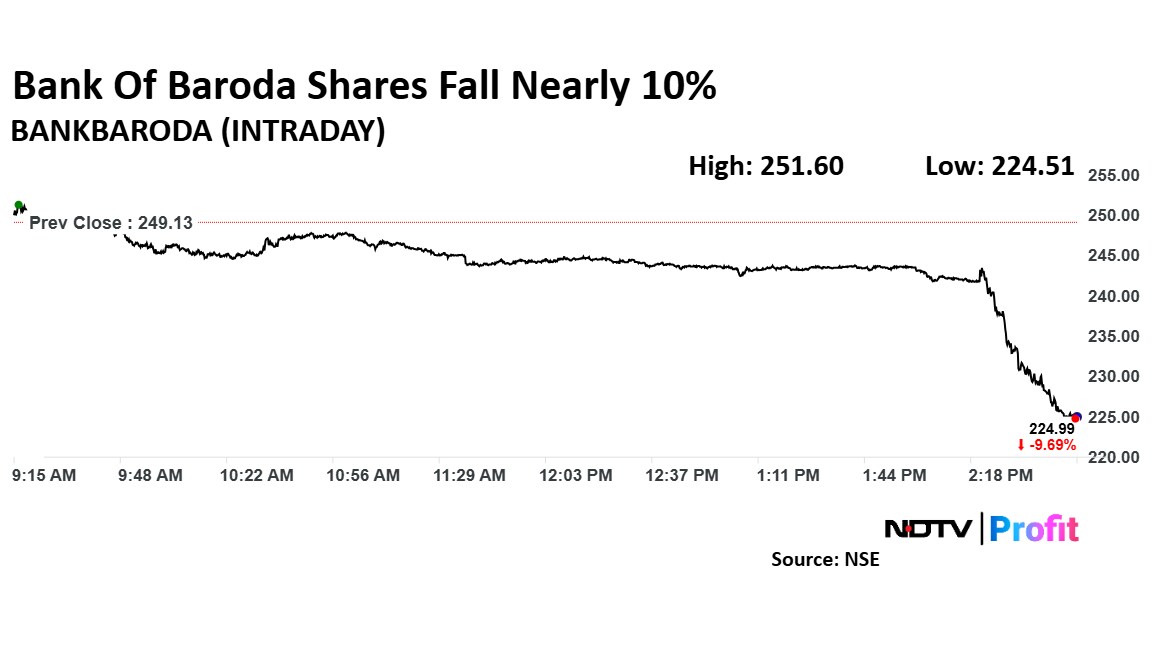 After the quarterly results were declared, shares of Bank of Baroda fell as much as 9.88% to Rs 224.51 apiece, the lowest level since April 15. It pared losses to trade 9.73% lower at Rs 224.88 apiece, as of 3:08 p.m. This compares to a 0.29% decline in the NSE Nifty 50 Index.