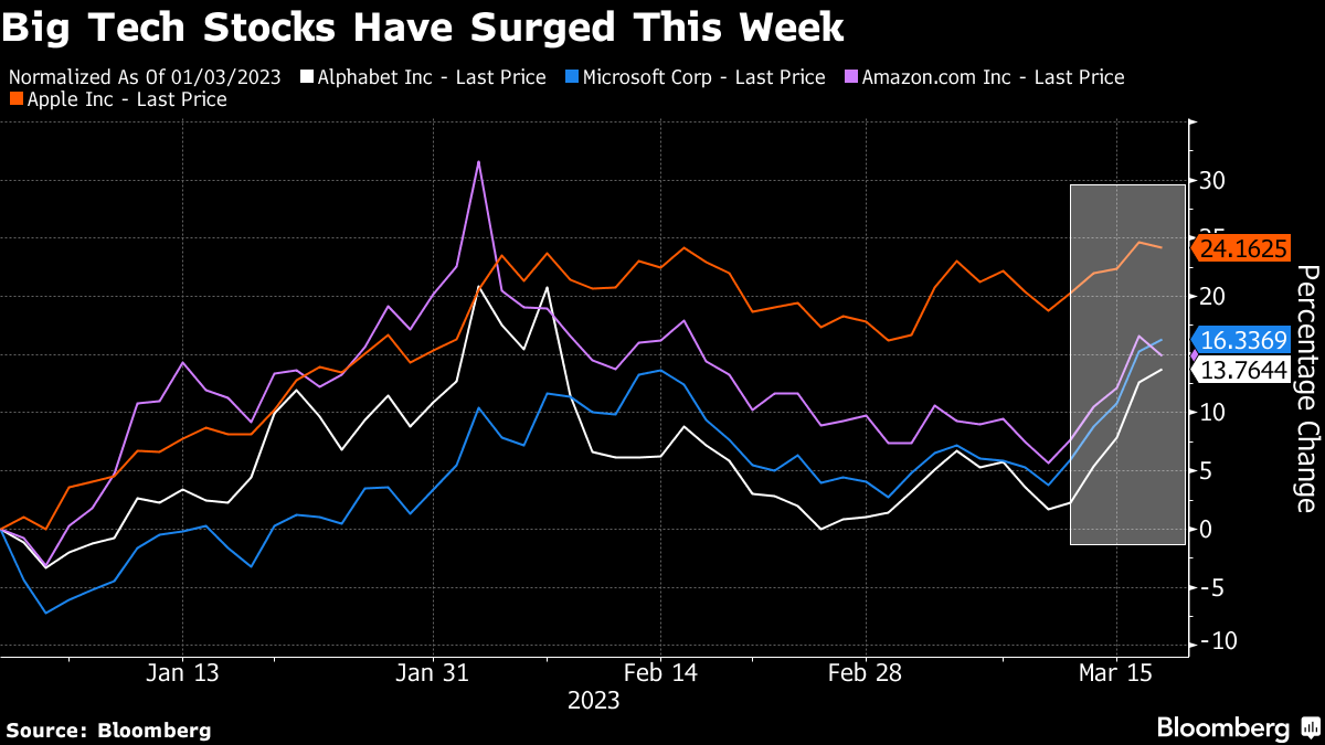 (Bloomberg) -- A miserable week for US banks has been a boon for the shares of the nation's biggest technology companies as traders flock toward their cash-rich balance sheets amid concerns about contagion in the financial sector.