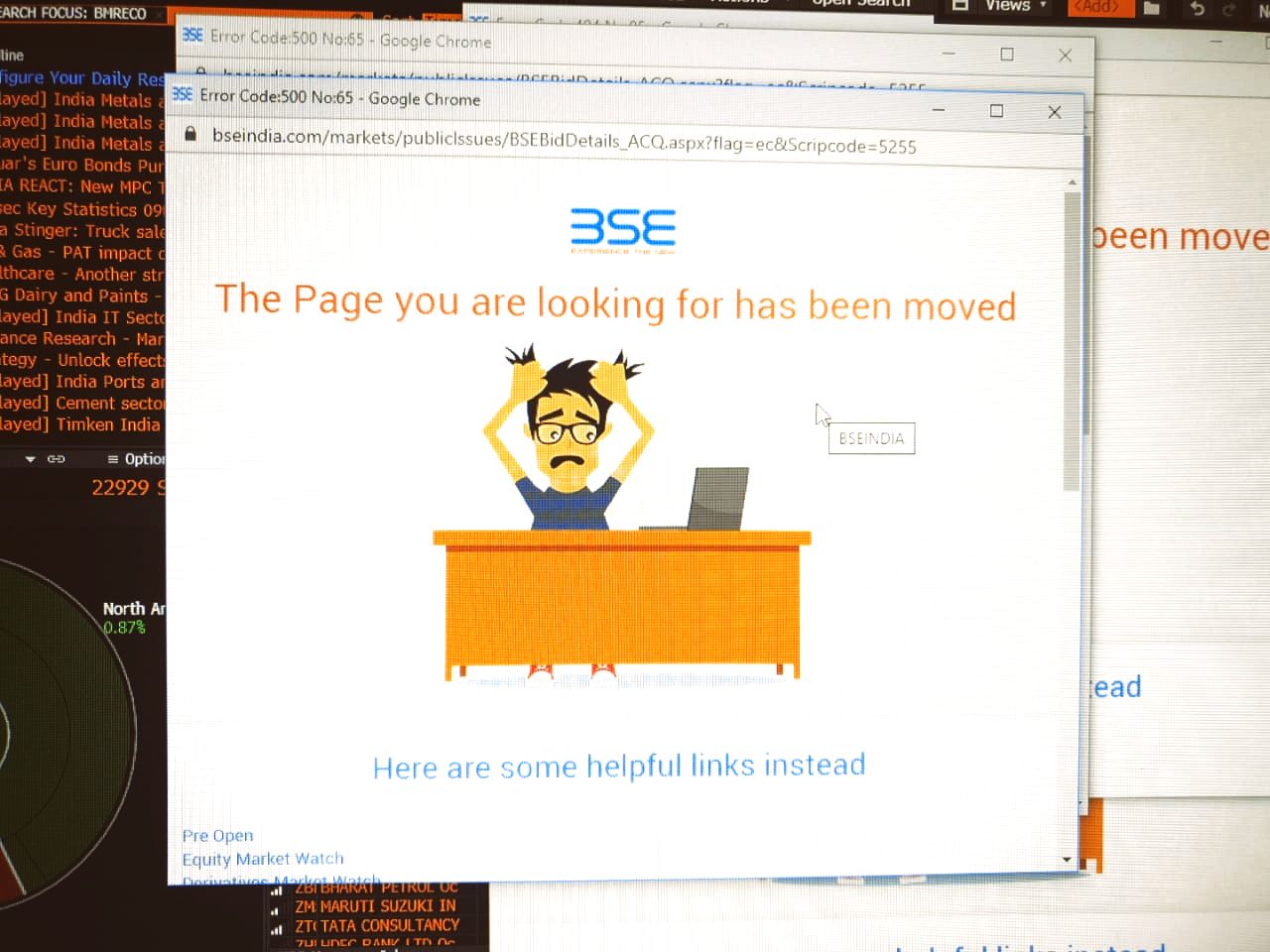 The BSE webpage that displays the reverse-book building offers was down during the day. The information on the page is used by retail investors to assess the bid and price at which reverse-book building will happen. The webpage, however, was restored around noon.