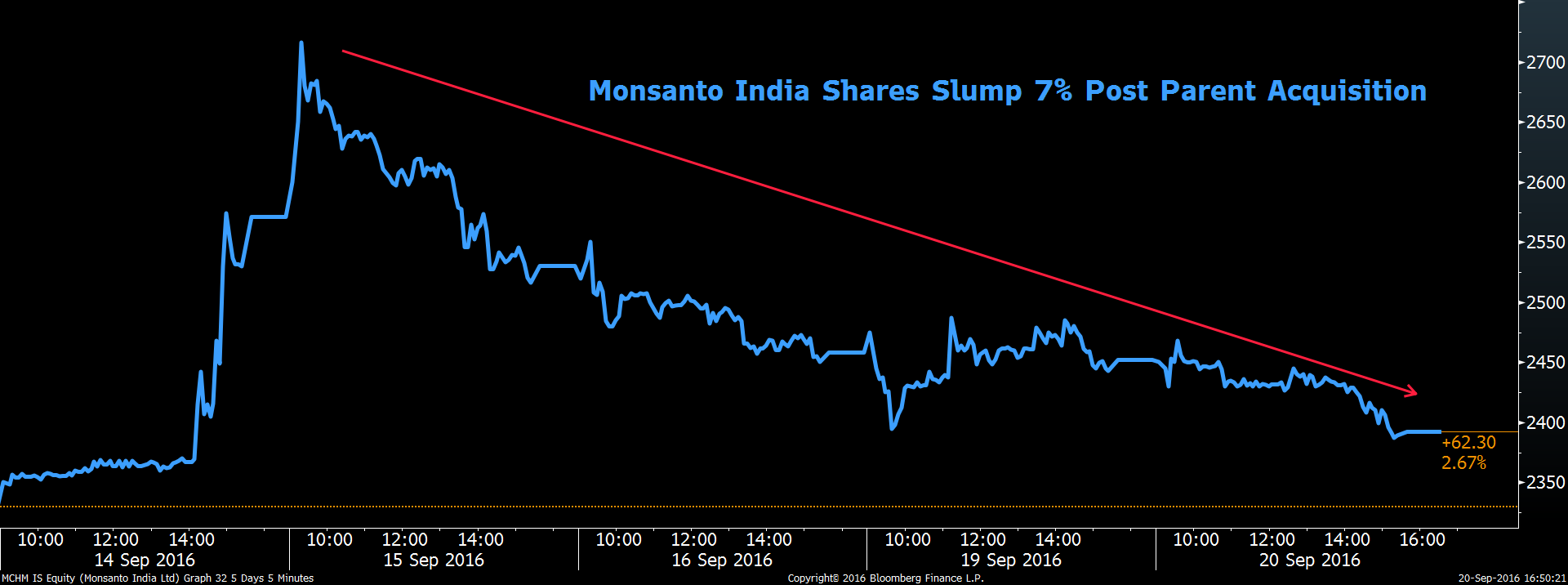 Monsanto shares surged 10.4 percent on September 14, 2016, but after the announcement of the acquisition, share prices slumped for four straight days, declining as much as 7 percent.