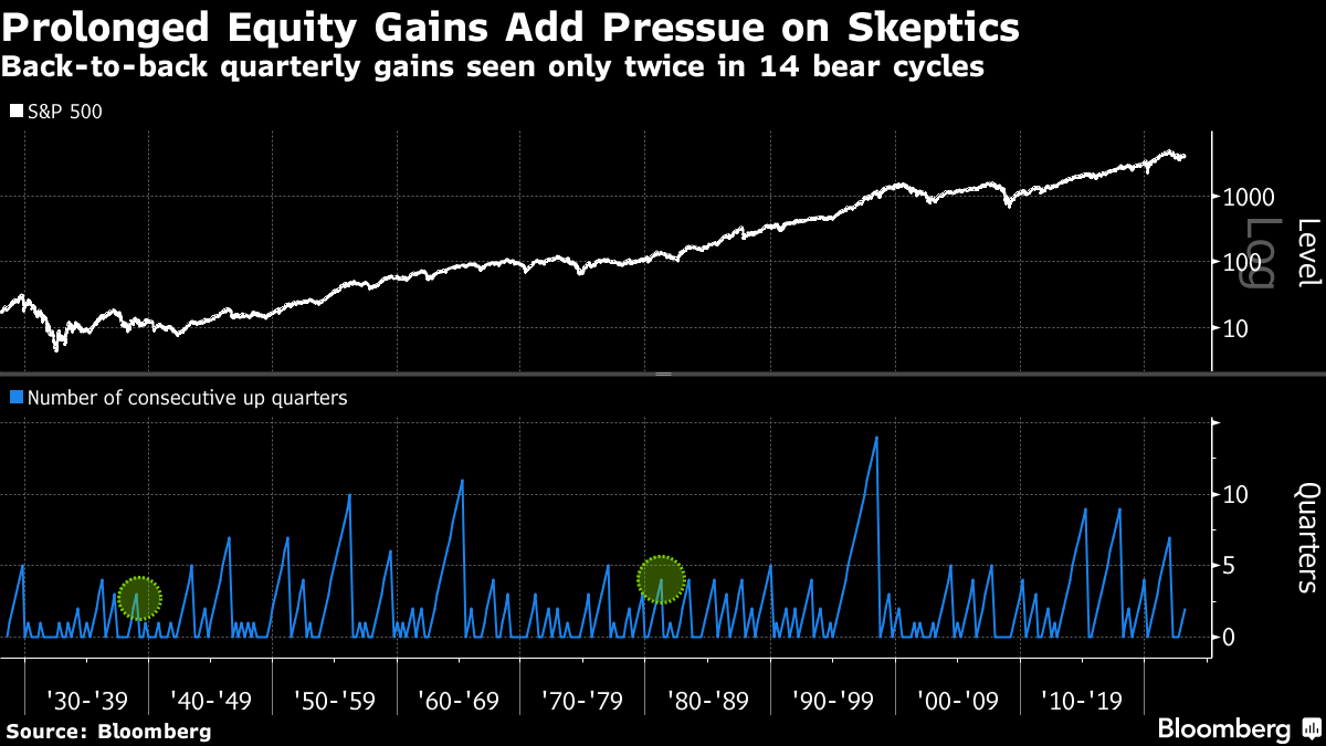Of the 14 previous bear markets, only two saw the S&P 500 experience back-to-back quarterly gains, in 1981 and 1938. Put another way, history is not on the side of bears when stock momentum is as strong as it has been.