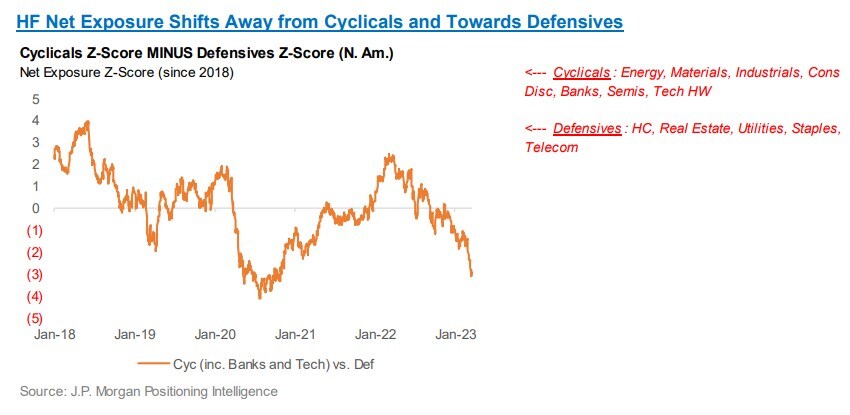 Among professional speculators, caution also prevails. Hedge funds have slashed their positions in economically sensitive shares such as banks, driving their cyclical exposure versus defensive stocks toward the lowest level since early 2020, according to JPMorgan Chase & Co.'s prime brokerage unit.