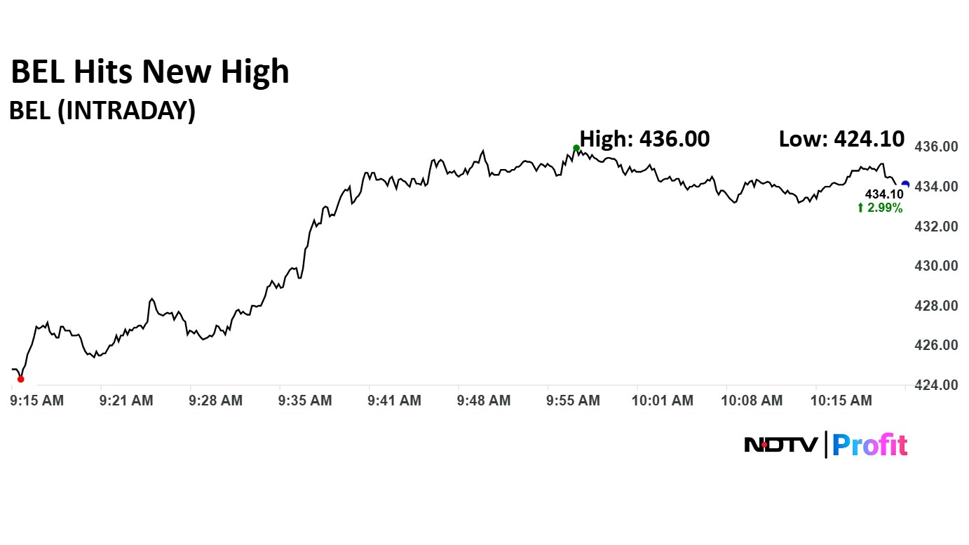 Bharat Electronics share price advanced 3.44% to a record high of Rs 436 apiece. The share price pared some gains to trade 2.94% higher at Rs 433.90 apiece as of 10:23 a.m., as compared to 0.04% advance in the NSE Nifty 50 index.