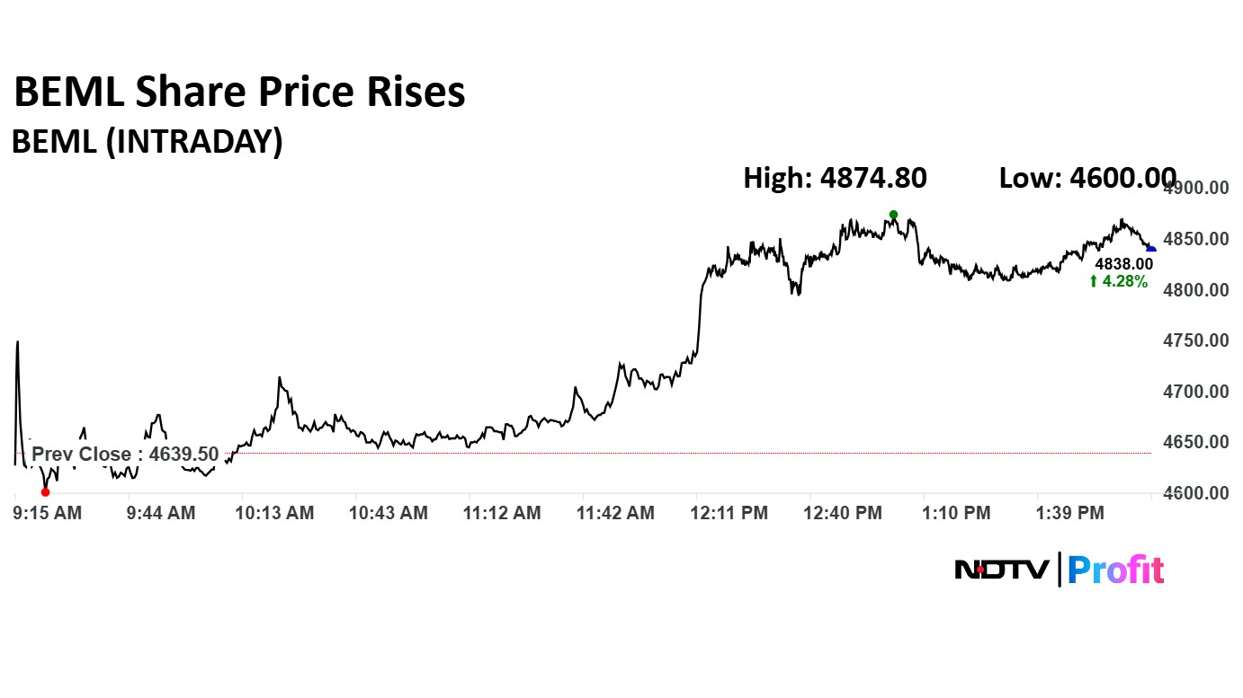 BEML was trading 4.31% higher at Rs 4,839.30 apiece as of 2:14 p.m., as compared to a 0.40% decline in the NSE Nifty 50 index.