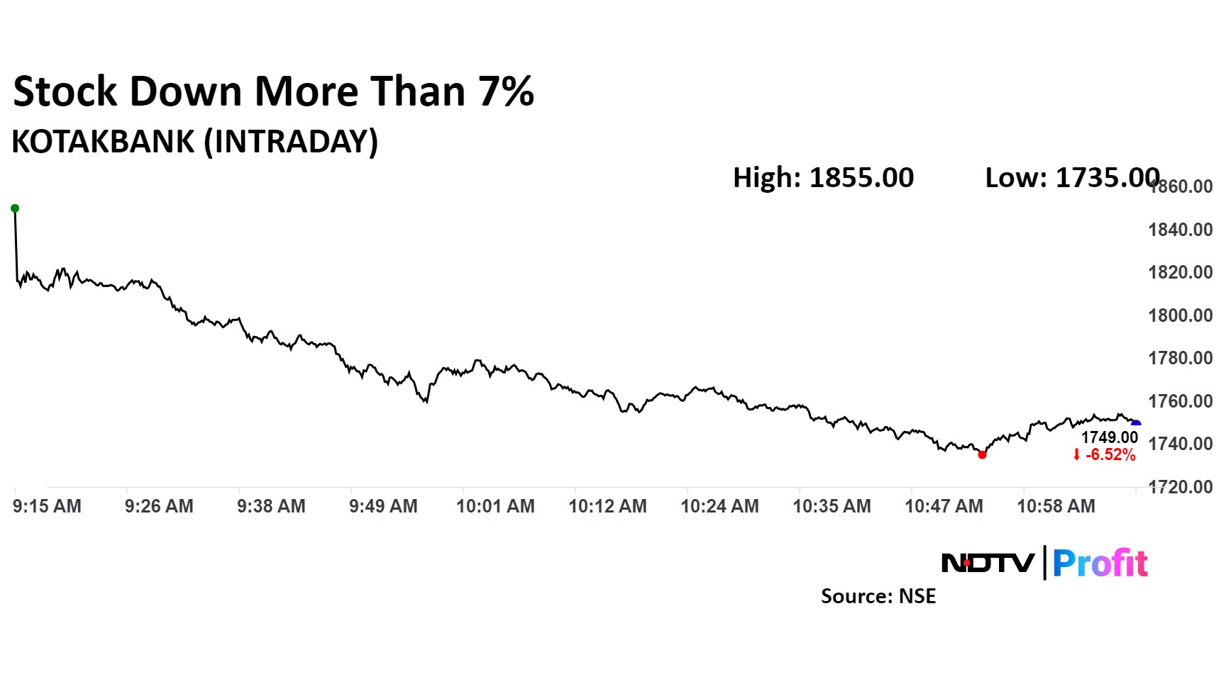 Shares of Kotak Mahindra Bank fell as much as 7.27% before paring loss to trade 6.44% lower at Rs 1,750.55 apiece, as of 11:07 a.m. This compares to a 0.11% decline in the NSE Nifty 50.