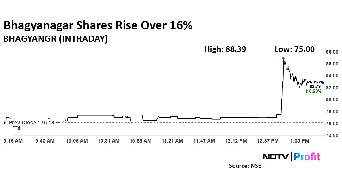 Shares of Bhagyanagar rose as much as 16.03% to Rs 88.39 apiece, the highest level since Feb. 11. They pared gains to trade 8.82% higher at Rs 76.18 apiece, as of 1:39 p.m. This compares to a 0.14% advance in the NSE Nifty 50.