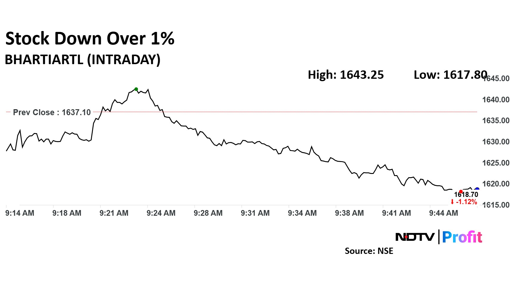Bharti Airtel share price fell as much as 1.11% to 1,619 apiece. At 10.10 a.m., the stock was trading 0.67% lower at Rs 1,626 per share.