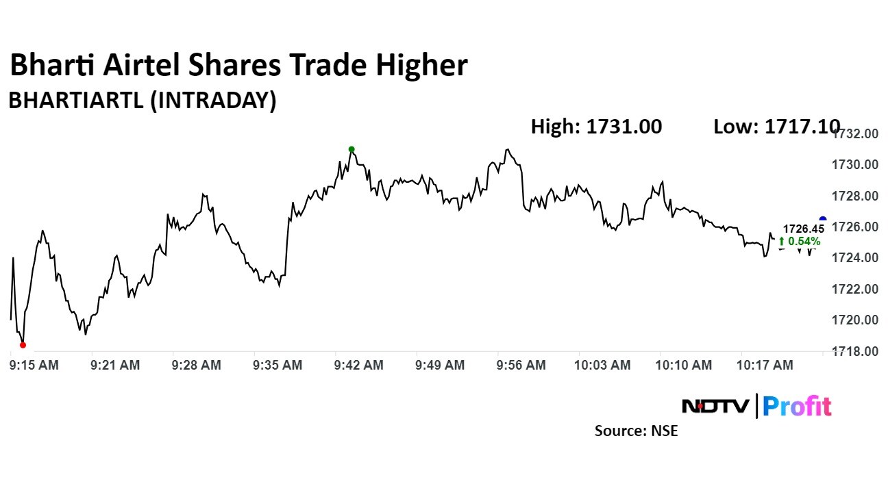 Bharti Airtel stock rose as much as 0.80% during the day to Rs 1,731 apiece on the NSE. It was trading 0.52% higher at Rs 1,726.10 per share, compared to a 0.14% decline in the NSE Nifty 50 as of 9:30 a.m.