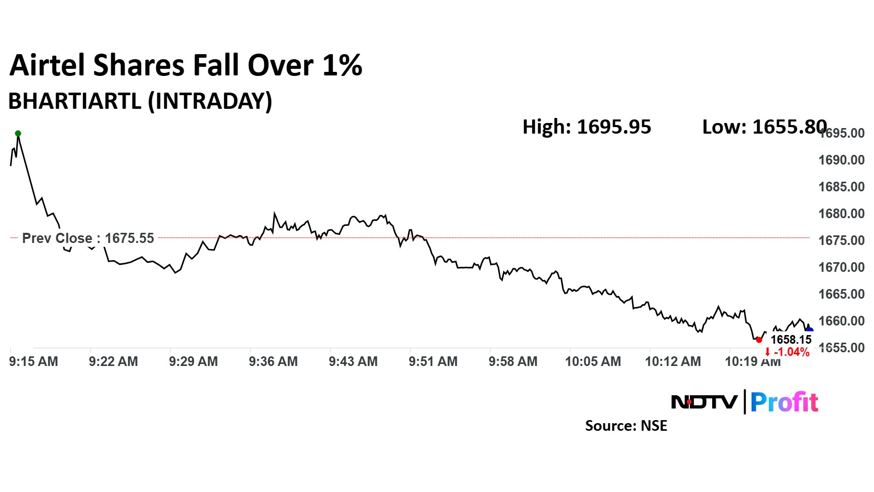 Bharti Airtel stock fell as much as 1.18% during the day. It was trading 0.84% lower at Rs 1,662.3 apiece, compared to an 0.52% decline in the benchmark Nifty 50 as of 10:33 a.m.