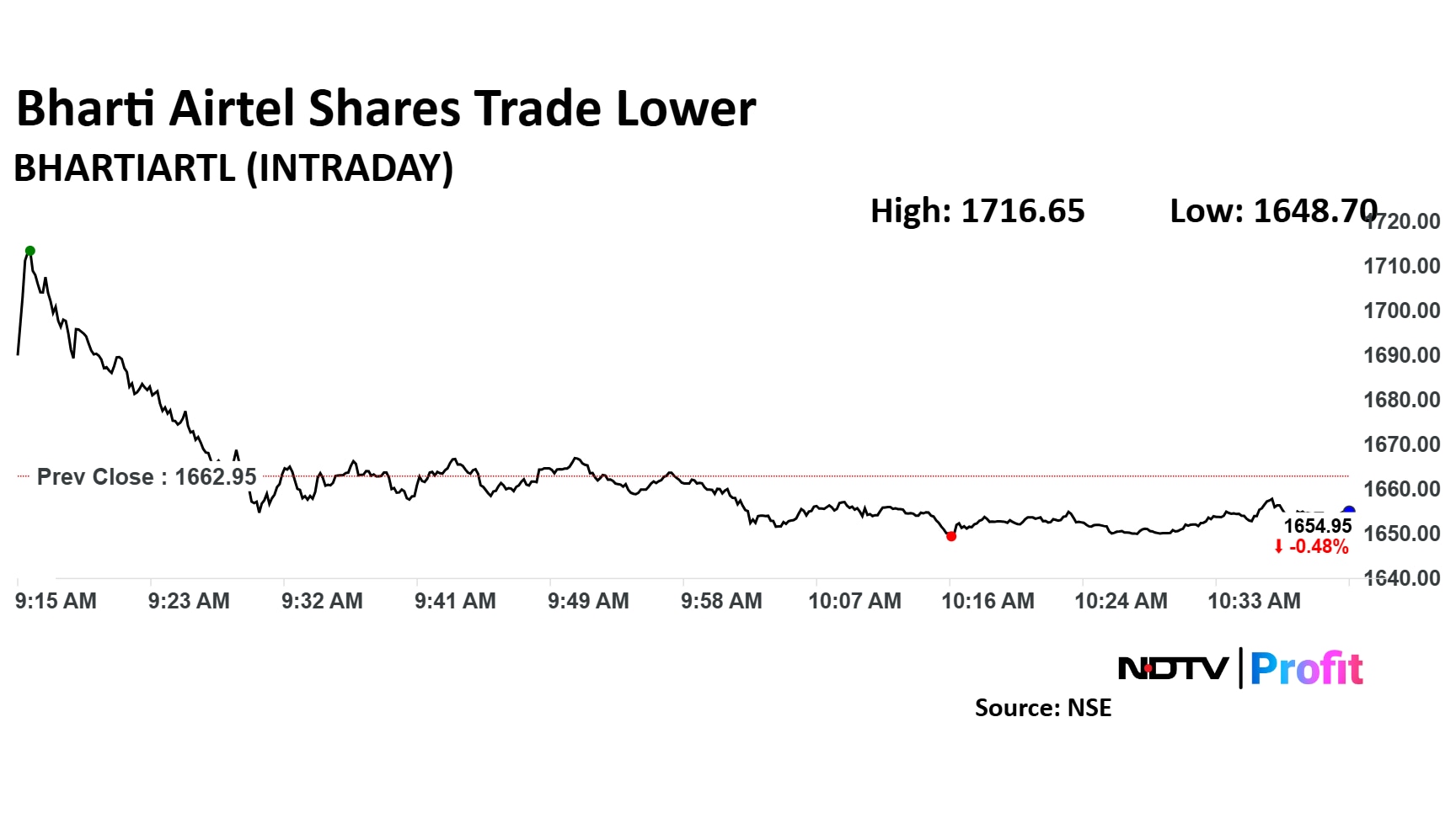 Bharti Airtel stock rose as much as 3.23% during the day to Rs 1,716.6 apiece on the NSE. It was trading 1.24% lower at Rs 1,642.30 apiece, as of 11:42 a.m., compared to a 0.64% decline in the benchmark Nifty 50.