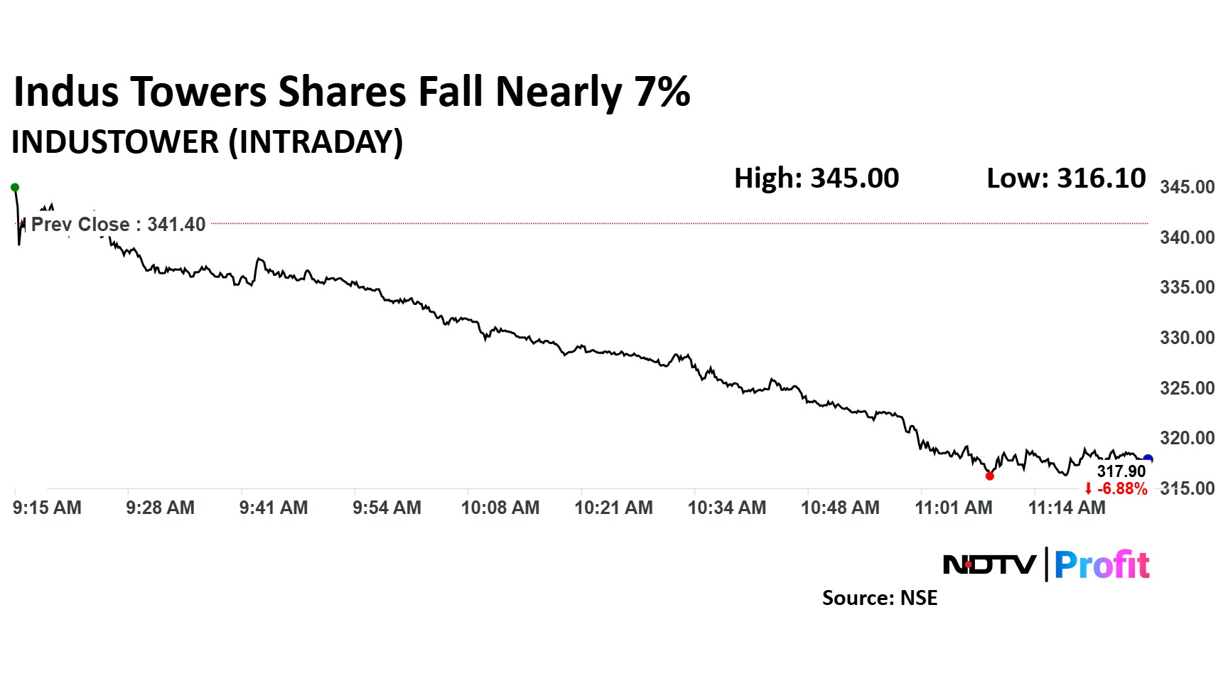 The shares of Indus Towers were trading nearly 7% lower at Rs 317 apiece, compared to a 0.40% decline in the benchmark Nifty 50. The stock had declined as much as 7.41% in trade on Wednesday so far.