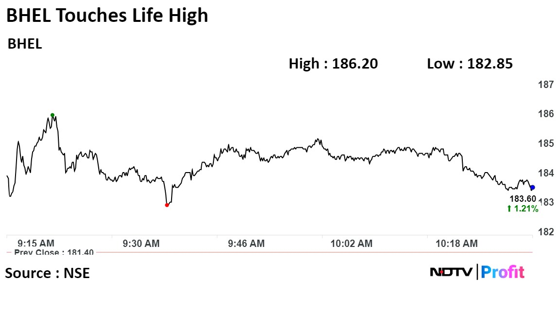 BHEL shares rose as much as 2.65% to Rs 186.20 apiece to reach its all-time high. It pared gains to trade 1.85% higher at Rs 184.75 apiece as of 10:23 a.m. compared to a 0.73% advance in the NSE Nifty 50 Index.