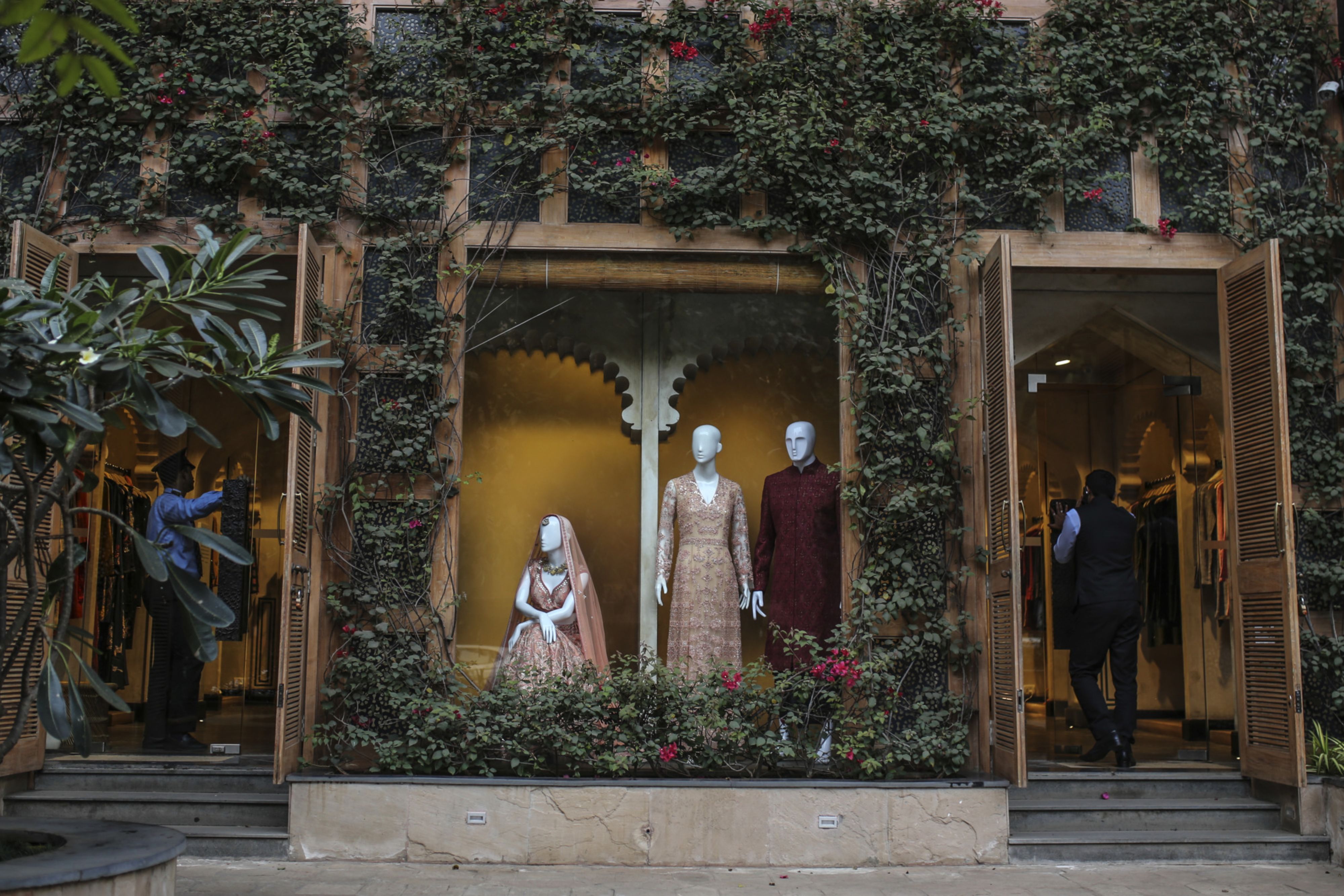 Mannequins displaying wedding dresses stand outside a clothing store in Mumbai. (Photographer: Dhiraj Singh/Bloomberg)