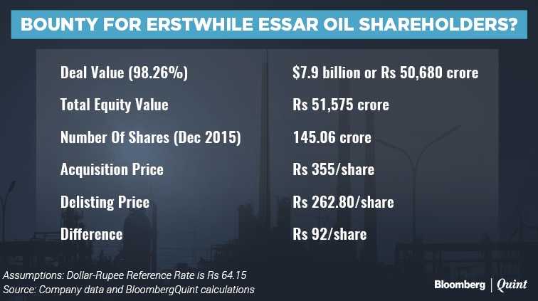 Initial calculations done by BloombergQuint suggest that the acquisition of Essar Oil by Russian oil major Rosneft and the Trafigura-UCP consortium has been done at Rs 355 per share versus the delisting price of Rs 262.8 per share. Essar is obligated by a decision of market regulator SEBI to pay the difference to shareholders who tendered shares in the delisting. This because the delisting was done even as acquisition negotiations had begun.
