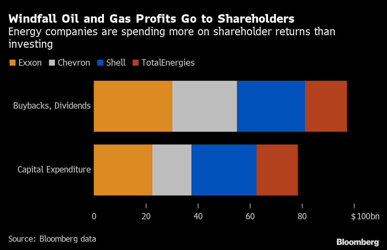 The controversy this week was not so much about the gargantuan dollar amounts earned but what the world's largest energy companies chose to do with them. Exxon Mobil Corp., Chevron Corp., Shell Plc and TotalEnergies SE are handing almost $100 billion to shareholders annually in the form of buybacks and dividends while reinvesting just $80 billion in their core businesses this year, according to data compiled by Bloomberg.